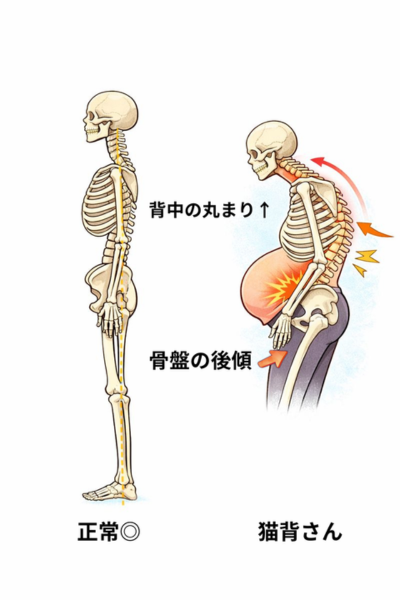 一見体の力がだらんと抜けているようにみえる猫背さん。でも実はこれ、妊娠による体の重心変化を、背中を丸めて支え続けている状態なんです。